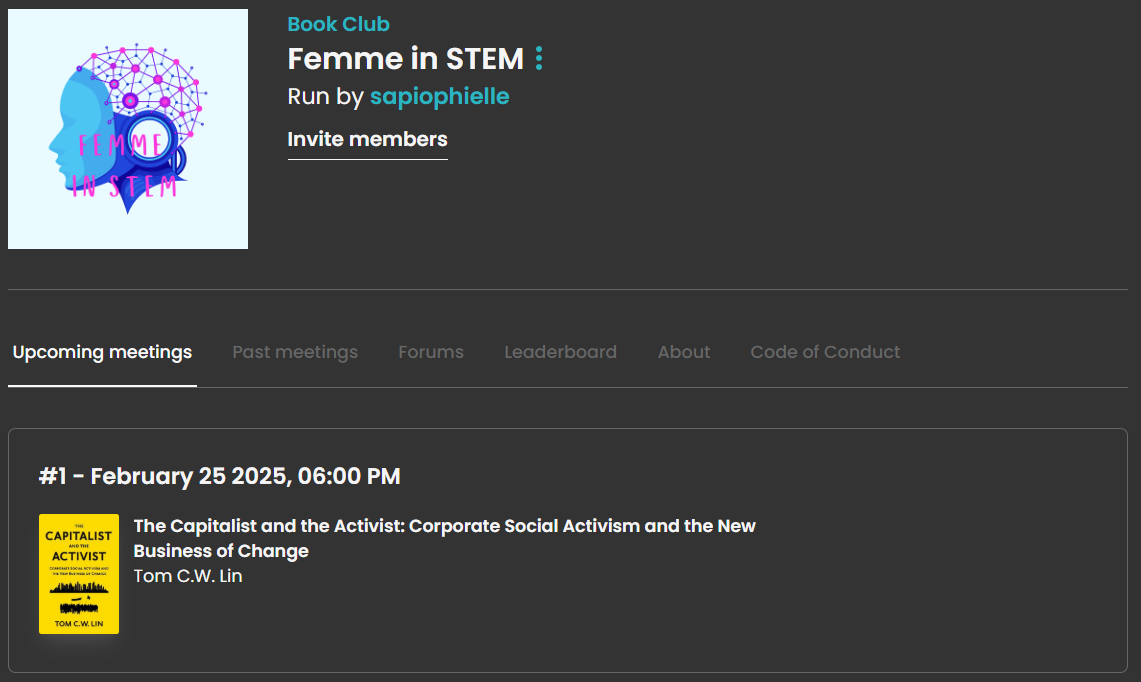 Using The StoryGraph app, our book club will focus on exploring the feminine side of the universe through science, technology, engineering, art, and mathematic (STEAM) activities, storytelling, and community projects. Learn how to build a more sustainable and kind world by embracing those who are different and uplifting our friends. Our first book will be The Capitalist and the Activist: Corporate Social Activism and the New Business of Change by Tom C. W. Lin.